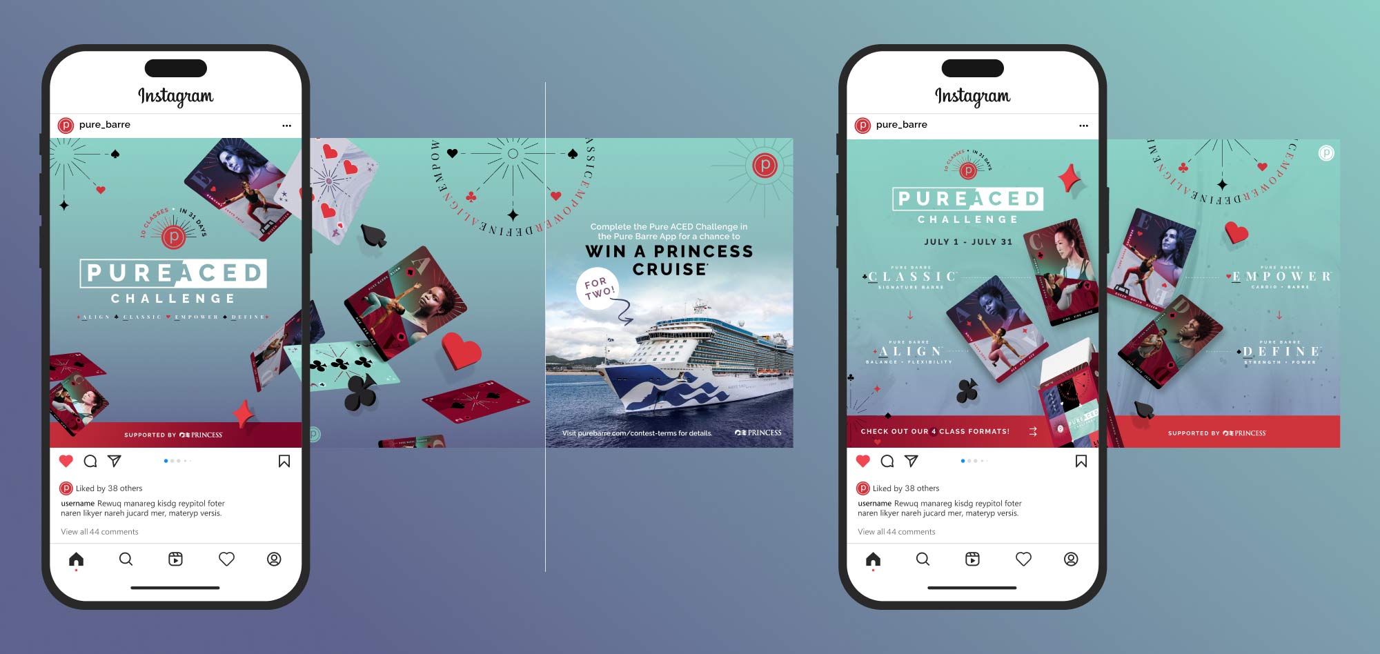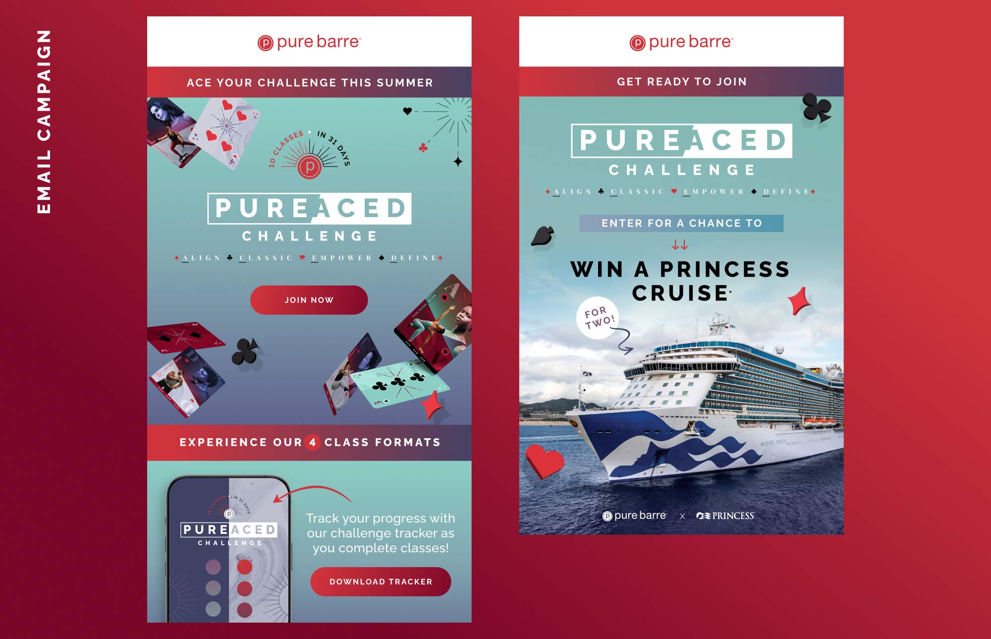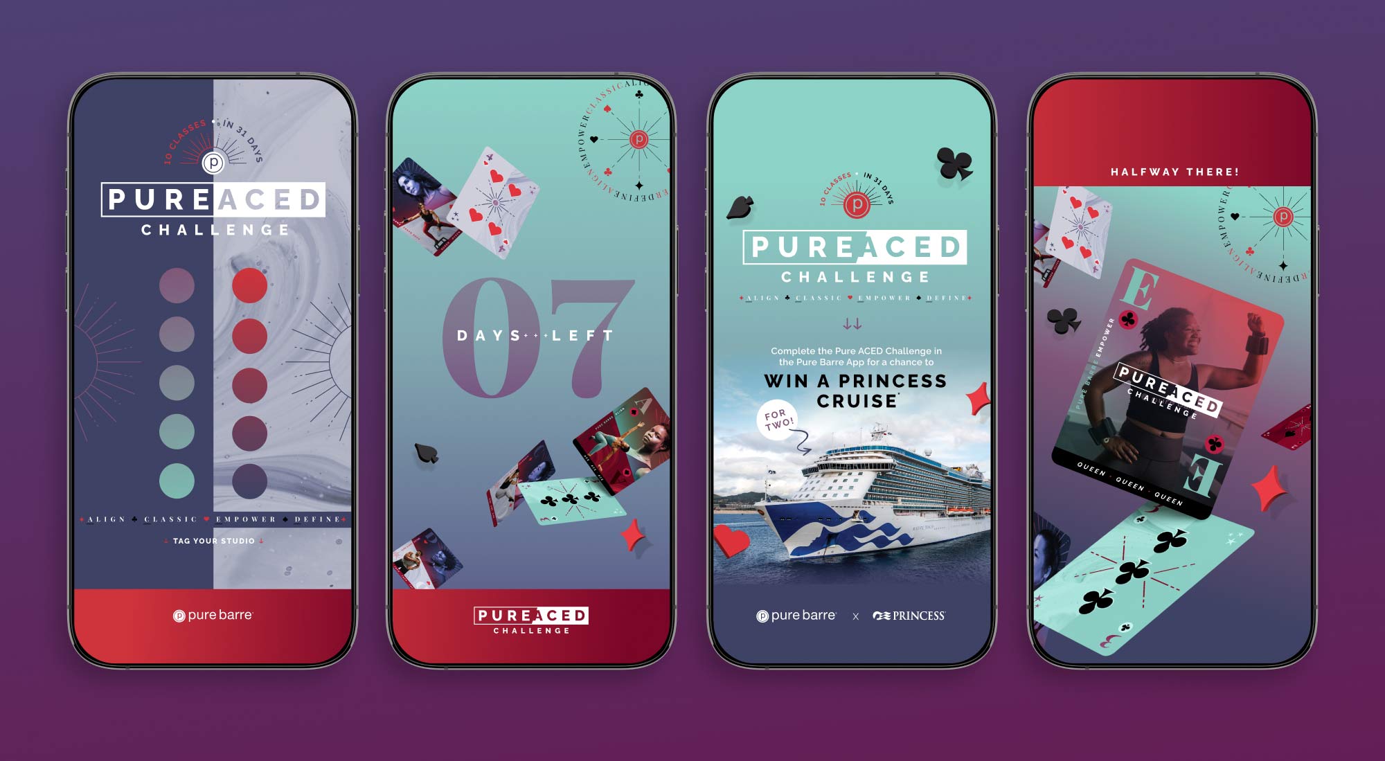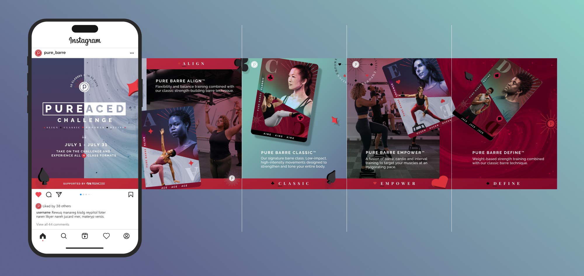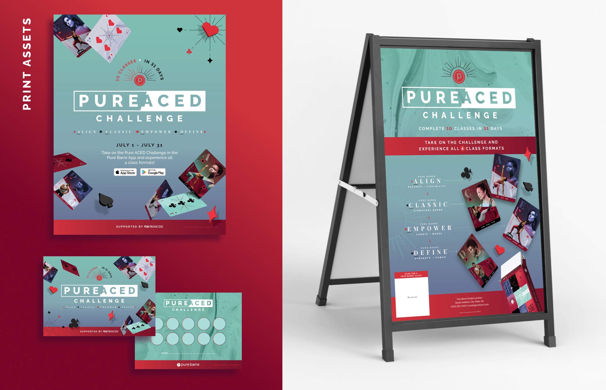 Pure Aced is a summer challenge encouraging members to experience all four class formats. The first letter of Pure Barre's classes spell out 'ACED' which became the initial inspiration for this concept. Playing off the idea of a card game, individuals "aced" their summer challenge. This concept offered a fun, new twist to Pure Barre's classes driving interest and new memberships. As Art Director, I developed this concept and directed the team to implement across all marketing touchpoints. As an added bonus, we also made a custom deck of cards that franchise partners could sell in their studios.